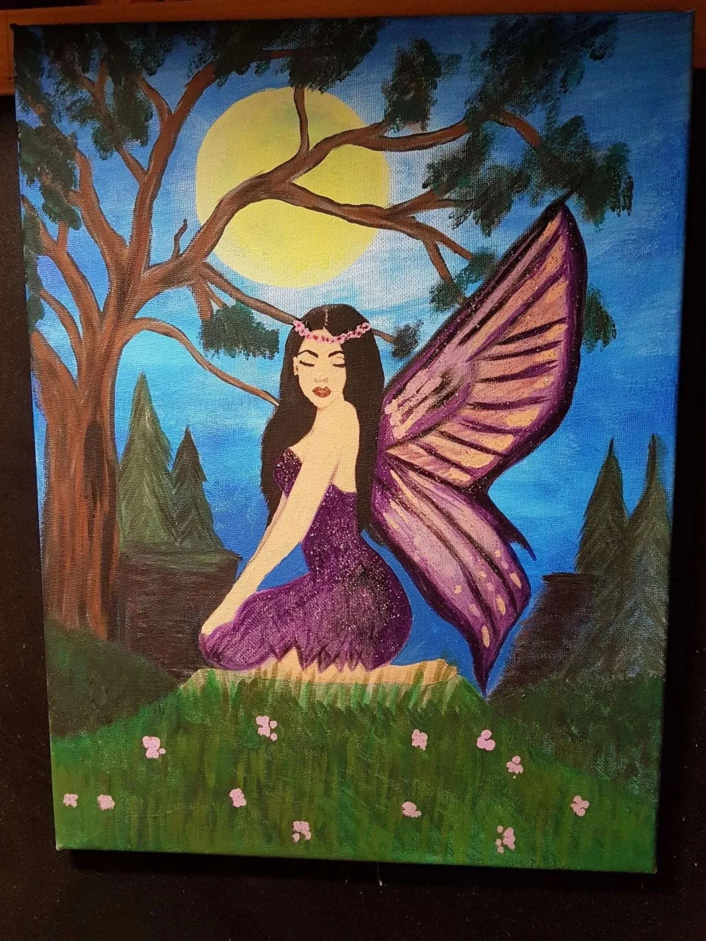 This is an original acrylic painting entitled Fairy No. #7, painted in 2022. It is signed on the front and back, and it is ready to hang. This painting shows a dark haired fairy resting in the light of the full moon. I loved making this piece with a beautiful fairy wrapped in layers of violet and pink. The trees rise out in the landscape and the moon shines down it’s light making her sparkle. I added touches of glitter paint on her wings, dress and flower crown so the surface catches the light and twinkles as you move past it. You can’t have a fairy without magical fairy dust!
